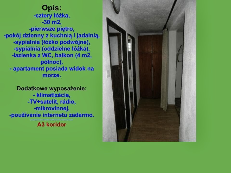 - Opis: cztery stack, 30 m2, Pierwsza Pietro, pokój dzienny s Kuchnia i jadalnią, sypialnia (łóżko podwójna), sypialnia (oddzielne stack), Lazienki s toaletom, balkon (4 m2, ponoć), Apartament posiada Widok na morze.