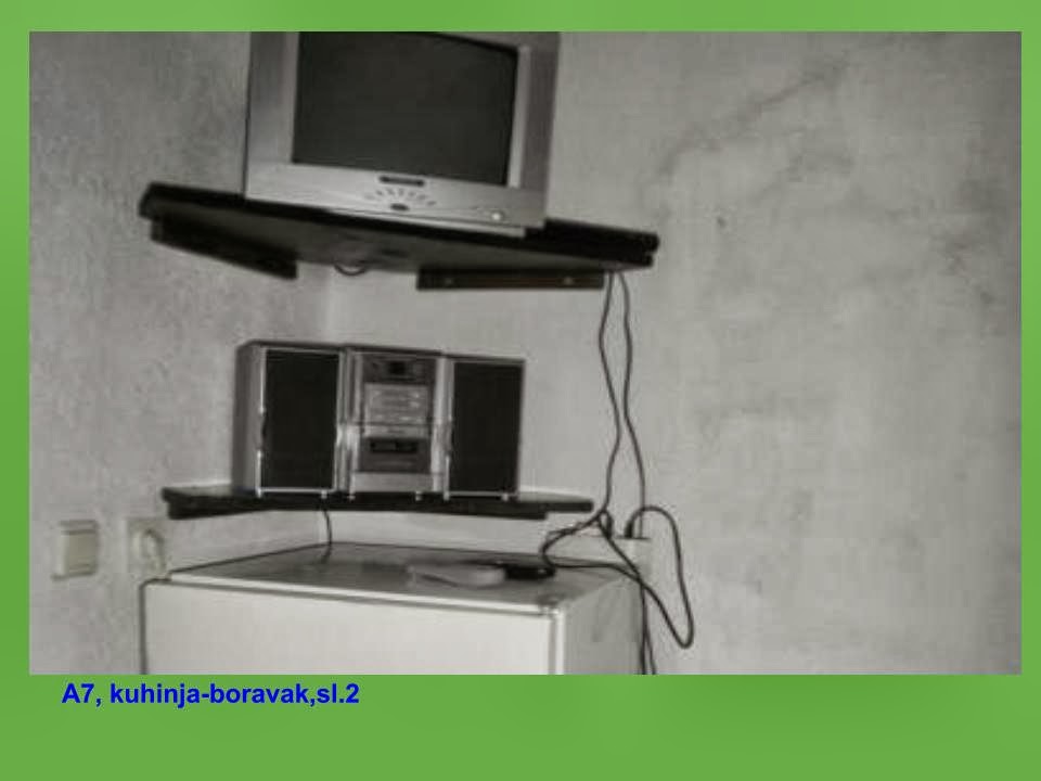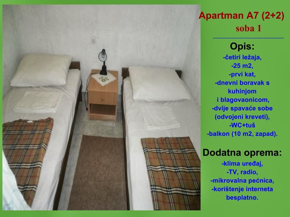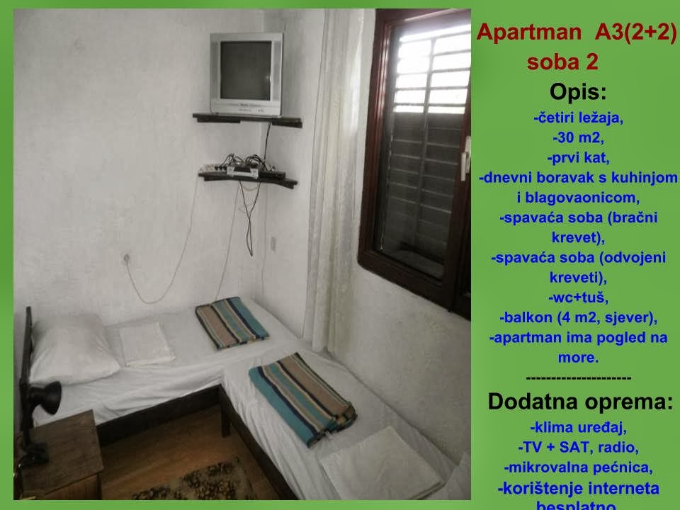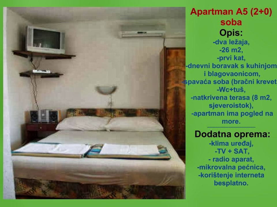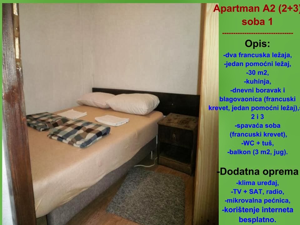 - Opis:  dva francuski ležaj, idiot back-end bed.30 m2, kuhinja, dnevni boravak i blagovaonica (francuski ležaj, idiot dodatni ležaj), spavaća soba (francuski ležaj), WC + tuš, balkon (3 m2, jug).